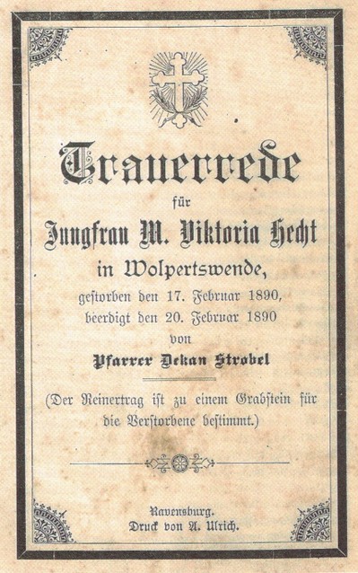 Nachdem sie über 30 Jahre bettlägerig gewesen war, starb Viktoria Hecht am Rosenmontag des Jahres 1890. In der Trauerpredigt am 20. Februar 1890 formulierte Pfarrer und Dekan Lorenz Strobel: "Nicht Wunder, sondern die Übung der Gottseligkeit dient zum Heil. In allem wie stiller, wie besser."